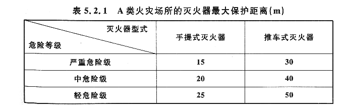 設(shè)置在A類火災(zāi)場(chǎng)所的滅火器,其最大保護(hù)距離應(yīng)符合表5.2.1的規(guī)定。