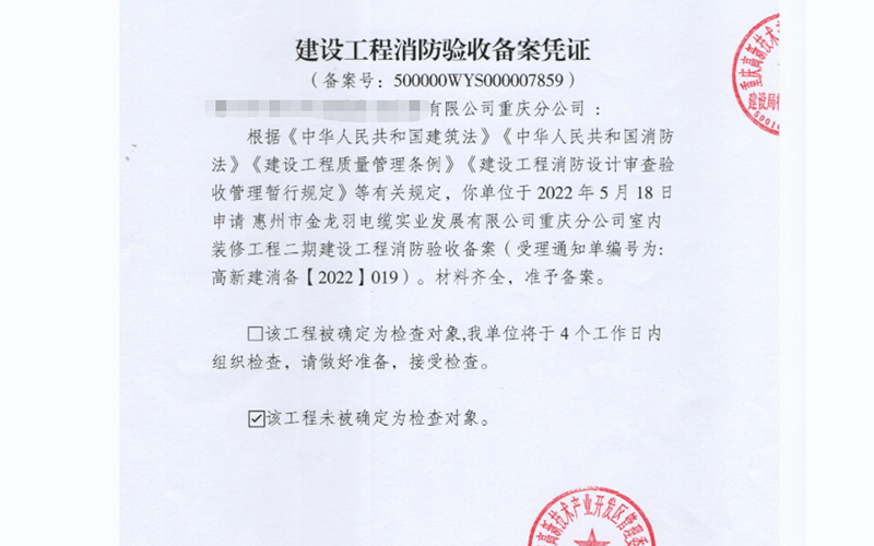 惠州市金龍羽電纜實(shí)業(yè)發(fā)展重慶研發(fā)中心有限公司消防備案案例-鼎堂消防