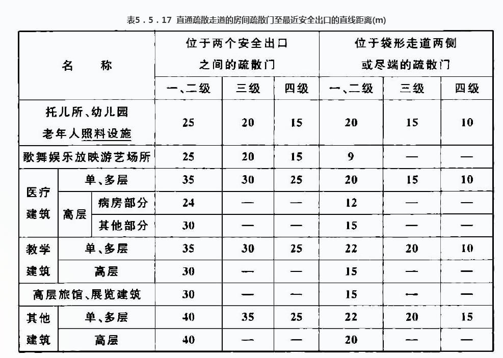 1 直通疏散走道的房間疏散門至最近安全出口的直線距離不應(yīng)大于表5.5.17的規(guī)定。